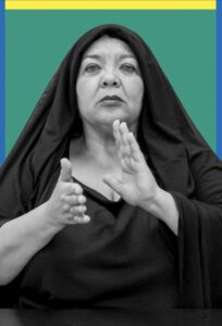 Puis apparaît Dalila Khatir en Mamma souriante et pleine d’humour, présence naturellement généreuse qui détend l’atmosphère et invite le public à prendre un verre de thé à la menthe, troisième séquence. Les plateaux circulent dans la salle, on dirait qu’on connaît depuis toujours cette belle figure totémique. Pourtant, couverte d’un voile noir, elle nous amène dans la tragédie, par le rappel de Sétif, en mai 1945 quand vingt-mille, peut-être même trente-mille Algériens furent massacrés par les Européens dans le Constantinois, évènement sur lequel est tombée une chappe de plomb. Petite fille d’un berger des Aurès, Dalila Khatir est née en France et n’a découvert l’Algérie qu’à quinze ans. Elle décrit les couleurs des Aurès et de l’Atlas, doré, ocre, le sable et l’horizon, son choc de découvrir ce pays, le sien, d’une grande beauté. Et elle nous embarque dans la mémoire de la mère spirituelle du Raï, Cheikha Remitti (1923-2006) mère aussi du Raï moderne, imprégnée de chant rural avant de se lancer dans ses apprentissages, chantant très librement l’amour, la femme, la sexualité, l’alcool, le choix de ne pas se marier, la liberté, censurée pour cela après l’Indépendance. Elle se met à chanter la joie de vivre, à danser, le drapeau algérien lui recouvrant la tête. Sa propre grand-mère entre dans le récit, « J’écoute ma grand-mère à l’hôpital psychiatrique d’Aix-en-Provence », elle lui parle de Dalida et de liberté. Celle qui se sent tiraillée des deux côtés de la Méditerranée et qui possède ses deux passeports, égrène les brimades d’une France ingrate quand en 1986 la loi Pasqua rejette certains ressortissants, y compris ceux nés sur son sol. Les drapeaux vont et viennent, d’Algérie et de France.