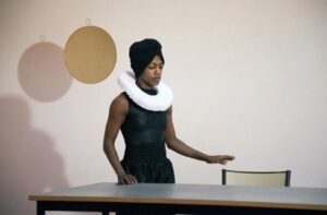 Adélaïde Desseauve aka Mulunesh, une jeune femme pleine d’énergie, baskets de boxeuse aux pieds et justaucorps noir, se raconte. « Je suis Mulunesh, Je suis Adelaïde Desseauve. Je suis née dans le berceau de l’humanité. » Originaire d’Éthiopie dans la fierté d’un pays jamais colonisé, orpheline, elle fut adoptée par une famille française. C’est de ce tiraillement entre ses deux cultures dont elle fait récit, dans un jeu de miroir. Une collerette de l’époque Renaissance autour du cou signe du classicisme, la danse traditionnelle Esqueta sur les rythmes du groupe ethnique amhara, mémoire de son pays, avec ses micro-mouvements ressemblant à des tremblements comme rotation des épaules et mouvements de la poitrine avant-arrière, ou encore balancements de la tête sur musique répétitive. Elle réinvente les pas de la mémoire par cette danse et, comme une reine de Saba, en fait la démonstration. « Je suis l’oubli, le trou de mémoire, face à la lune, au soleil, à la nuit. Je suis une langue, l’amharique. Je suis l’hybride, le bizarre, l’étrange… »