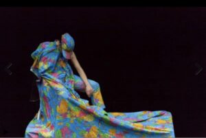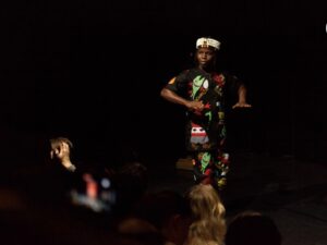 Ce même tissu-monde sera le lien entre les parties et circulera parmi les spectateurs tandis que Ouidah, ville côtière du Dahomey de l’époque, aujourd’hui le Bénin, nous est montré comme plaque tournante du commerce des esclaves. Un acteur porteur de la culture locale apparaît, Folly Romain Azaman, il témoigne par la danse. À Ouidah le ciel est rouge, on pratique une multiplicité de langues dont le fon, l’une des langues majoritaires ; la danse funéraire du zinli rythmée par les crotales monte jusqu’à la transe ; les figures du costume sont déclinées ; le danseur nous initie au culte animiste du Vaudou, religion d’ordre cosmique. À Ouidah se trouve le temple des Pythons, le plus sacré des sanctuaires. « Je suis le fils de … » la liste des appartenances est longue de même que la liste des divinités – dieu de la guerre et des forgerons, dieu de la terre et des guérisons, esprit de la connaissance, dieu de l’orage et de la foudre -. « Je suis l’invisible… Je suis un buffle… Je suis un animal… Je suis folie… Je suis un fou… » Un premier roi du Dahomey avait marqué son opposition aux colons français, en 1890. Sur scène et dans le public, il appelle les ancêtres par le chant et la danse.