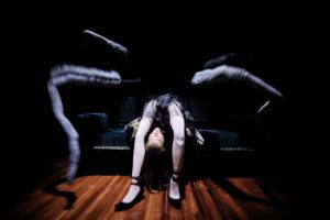 Krogstad revient et ne pouvant obtenir gain de cause avance dans le chantage. Il menace d’écrire une lettre à Torvald Helmer, donc de la dénoncer. Prise de panique dans ce tourbillon de suspicion et coincée dans ses non-dits, Nora perd pied : les enfants s’effacent du plateau et disparaissent d’une manière singulière, d’étranges araignées sortent de trappes qui se soulèvent à peine et traversent la pièce. Petit à petit Nora est envahie de ces tarentules étranges aux paires de pattes de plus en plus grandes jusqu’à devenir monstrueuses, comme ces trolls sortis des légendes scandinaves dont Ibsen a tissé son théâtre dans Peer Gynt. Comme si ses propres démons allaient l’engloutir elle devient elle-même tarentule, cette araignée mythique de l’Italie. De tarentelle qui devient ici une danse de morsure, une danse enragée, à tarentule, il n’y a qu’un pas – à l’origine la tarentelle était d’ailleurs une danse thérapeutique pour soigner les morsures. On bascule dans un autre monde, celui du fantastique et de la terreur où l’enfermement se précise, où le piège se referme.